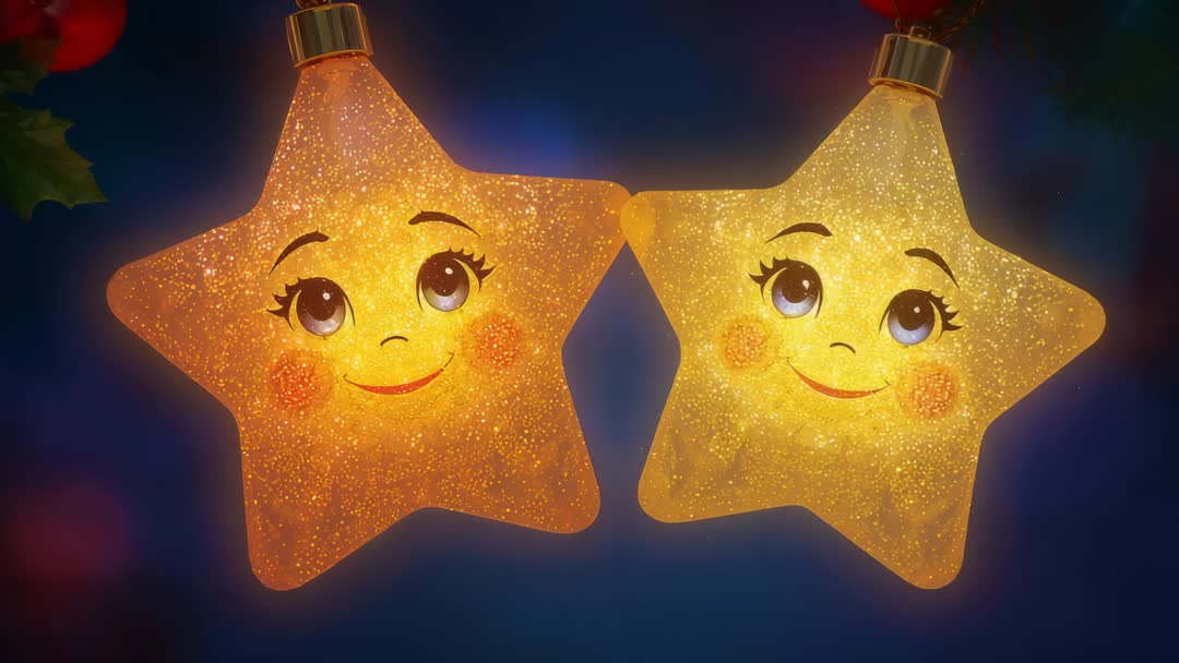 AI Generated Video. Featuring two glittering gold star ornaments with friendly smiling faces, hanging against deep blue holiday backdrop with subtle holly accent. Emitting warm golden glow and delicate sparkles, creating cozy festive atmosphere for seasonal projects. Color palette featuring warm gold, deep navy, hints of holly green and red. Working well for video intros, social media reels, animated greeting cards, children's holiday programming, retail promotional spots, and website banners. Supporting text overlay and logo placement by leaving negative space around stars; suitable for looping background or tranquil slow pan. Pairing with soft bells or acoustic guitar for seasonal videos; using as playful element in product packaging mockups or printable holiday crafts. Noting AI-generated origin for creative transparency and licensing clarity.
