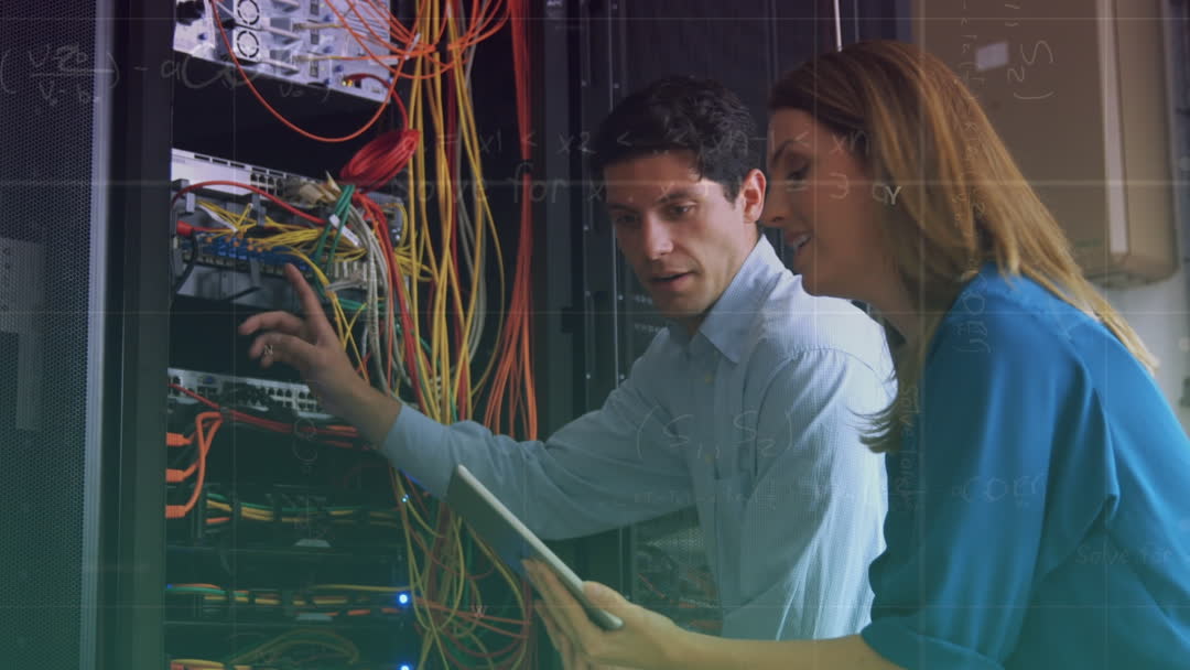 Two IT professionals, one male and one female, are actively managing and interacting with computer servers. This scene represents collaboration and technical problem-solving in an IT environment. Useful for illustrating concepts related to data connectivity, server administration, teamwork in tech, and IT operation scenarios.