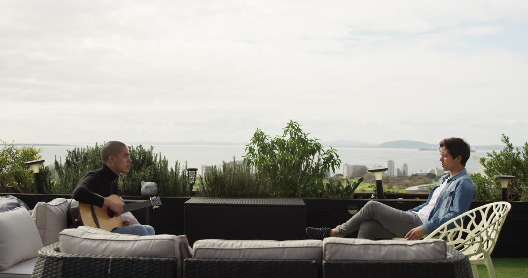 - Two Men Relaxing on Rooftop Terrace with Guitar on Cloudy Day