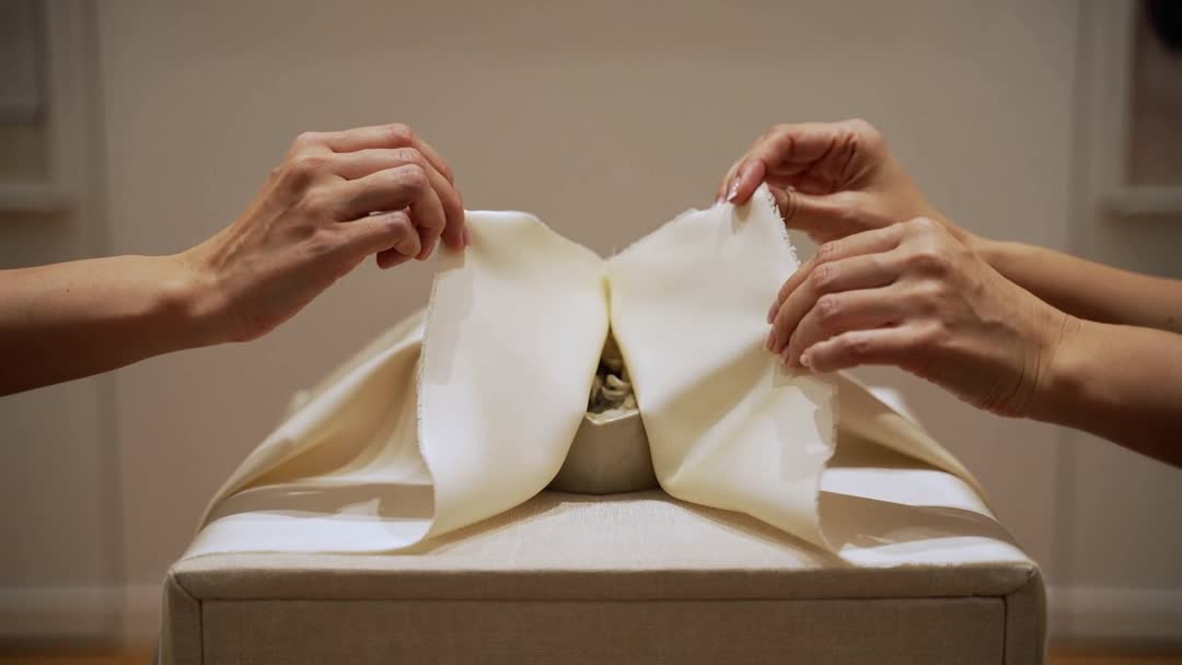 Two Pairs of Hands Uncovering Draped Fabric Revealing Ceramic Vessel with Foam Video