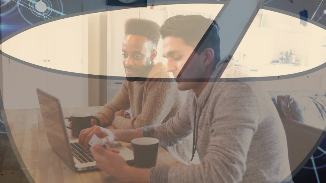 Two men sit at a shared workspace, absorbed in their work on a laptop. The graphics of global connections overlaying the scene emphasize modern communication and data exchange, offering a dynamic representation suitable for illustrating concepts of teamwork in technology-driven environments and global interconnectedness.