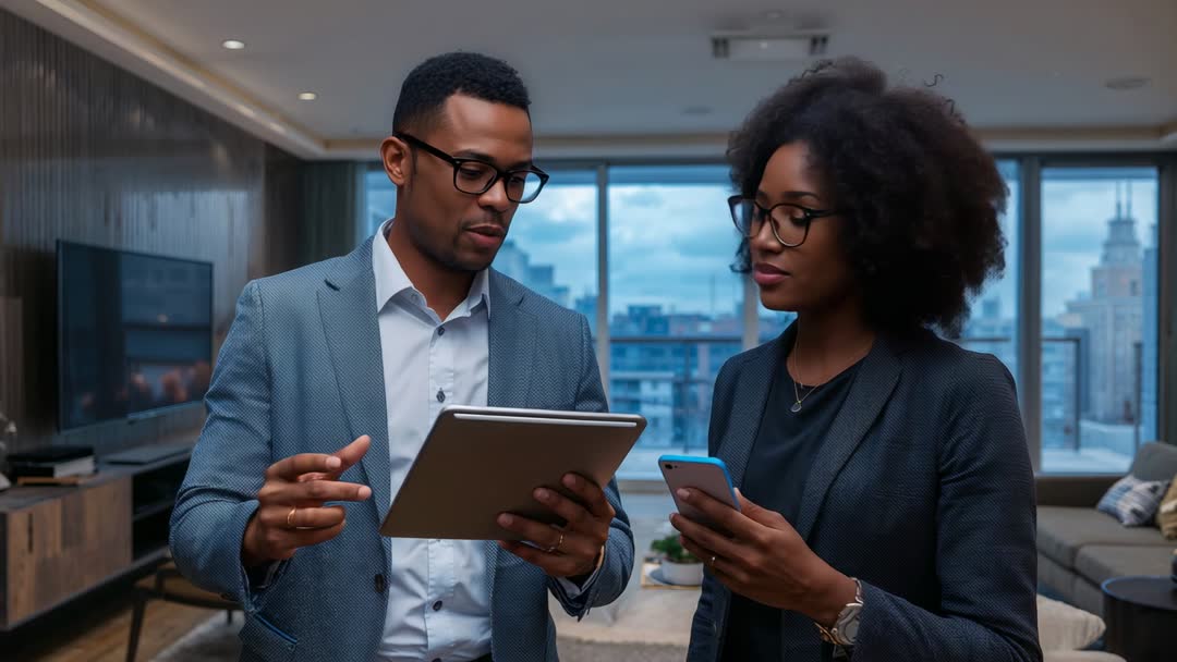 AI Generated Image. Clip showing two professionals collaborating over tablet and smartphone in modern office lounge with city skyline background. Male pointing at tablet while female comparing data on phone, discussing strategy, planning next steps. Mood conveying teamwork, digital workflow, modern corporate culture, quiet confidence and focused communication. Use for corporate presentations, website hero banners, social media ads, training modules, startup pitch decks, internal communication, recruitment campaigns, technology and fintech articles. Edit-friendly shot with natural window light, shallow depth of field, warm interior tones, suitable for lower-third graphics and overlay text. Licensing friendly footage for commercial, editorial and marketing projects.