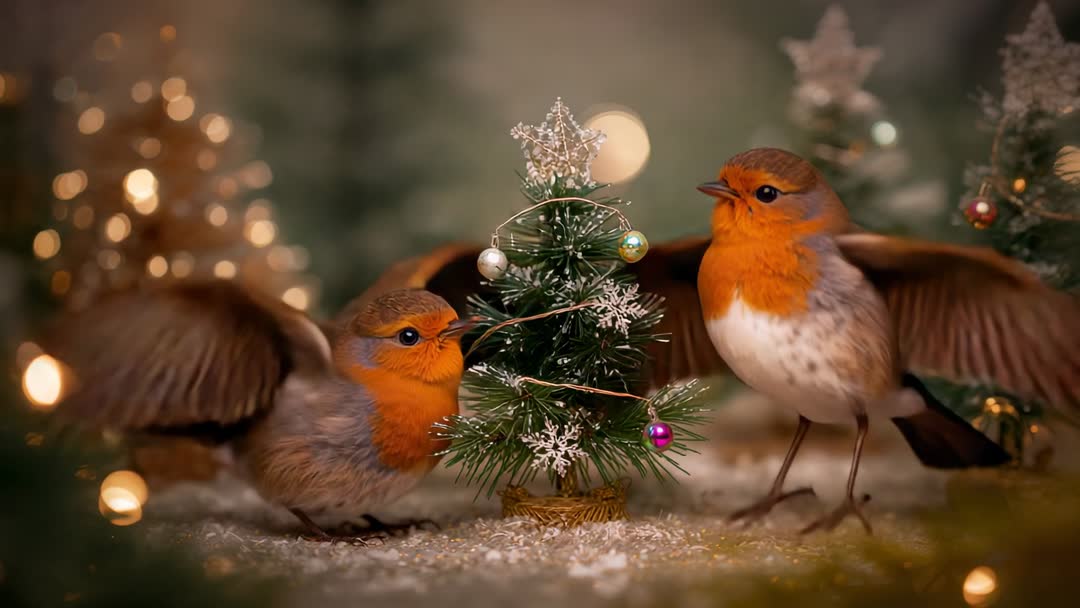 AI Generated Video. Video clip showing two European robins spreading wings near miniature decorated Christmas tree on snowy tabletop with warm bokeh lights. Scene capturing playful interaction, bright orange breast feathers, soft falling snow granules, and tiny glittering baubles. Shallow depth of field and warm color palette creating cozy festive mood. Clip featuring gentle wing motion and intimate close-up composition that is ideal for short holiday clips or animated greetings. Usage ideas: holiday greeting cards, seasonal social media campaigns, website hero banners, e-commerce winter product mockups, festive blog headers, greeting card animations, children's story backgrounds, nature or wildlife video montages, and digital holiday ads. Shot style notes: cinematic bokeh, soft focus background, warm highlights and sparkling accents. Clip containing AI-generated elements for stylized seasonal content.
