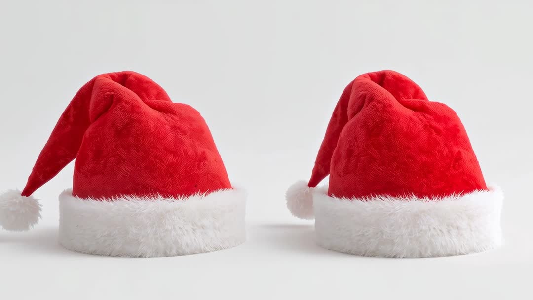 AI Generated Image. Close-up video showing two red Santa hats with white fluffy trim and pompom shifting subtly on white tabletop. Left hat tail drooping while right hat tail holding slightly higher, creating gentle motion and playful contrast. Neutral white background creating clean minimalist look for easy text overlay, branding, and product placement. Video working well for holiday e-commerce banners, social media reels, website hero loops, email headers, retail signage, seasonal ad campaigns, and animated greeting cards. Suggestions for use include looping short section for seamless motion, adding warm jingle or sleigh-bell audio, applying shallow depth-of-field to emphasize plush texture, adding overlay text and logo in top third, and cropping for vertical formats suited to Reels and Stories. Color palette tips include pairing red and white with evergreen and gold for traditional holiday feel or pairing with black and silver for modern minimal campaign. File suiting product mockups, catalog spreads, packaging, festive blog posts, and gift guides.