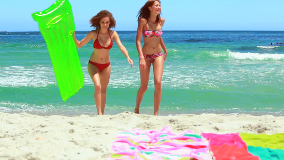 Two women wearing bikinis enjoy a sunny day at the beach, carrying a green air mattress, highlighting the carefree and vibrant atmosphere. Ideal for content related to summer vacations, beach activities, youthful joy, and outdoor leisure. Perfect for travel advertisements, lifestyle blogs or social media campaigns featuring vacation destinations.