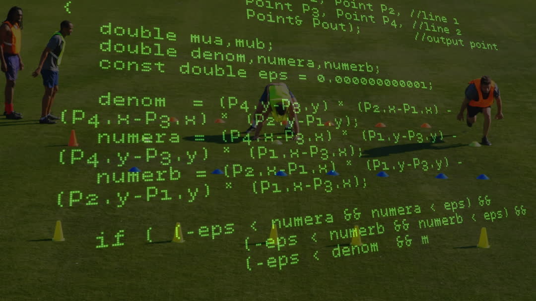 Two soccer players doing push-ups on a sports field, accompanied by a green digital data overlay of coding scripts. This aligns sports training with technology by visualizing data analysis. Image suitable for illustrating concepts related to smart sports, data analytics in physical training, and the interplay between technology and athletic performance brought to the visual level via overlays.