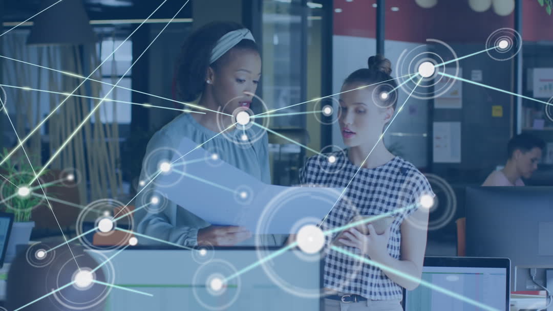Two diverse women are engaged in discussing documents in a contemporary office environment. Network and connection animations overlay their interactions, suggesting themes of technology and innovation. This could be useful for representing modern business concepts, team collaboration, or global networking applications.