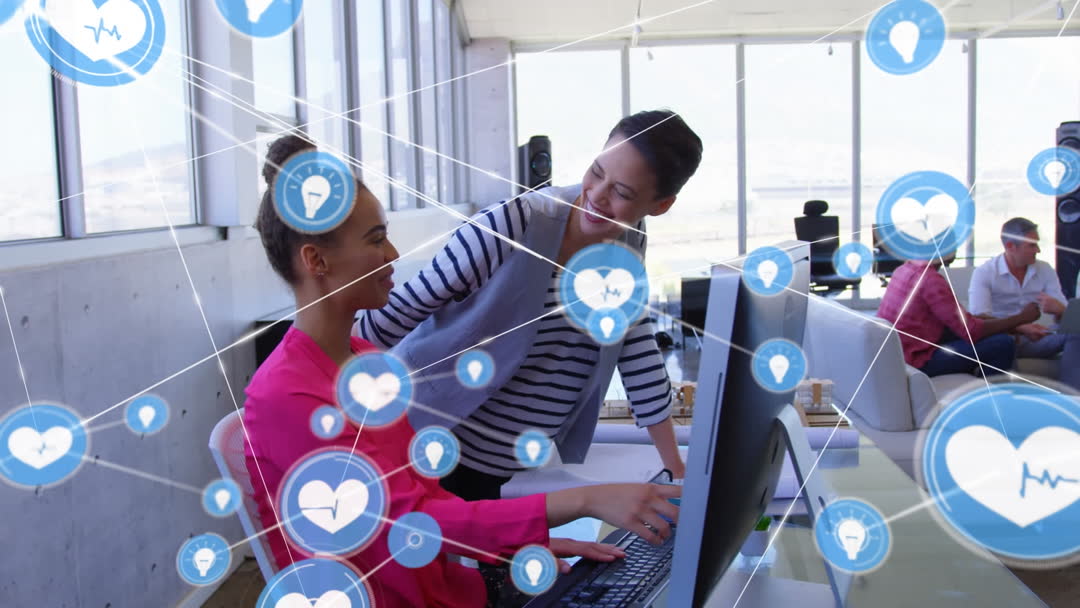 Depicts two businesswomen engaged in discussion over a computer in a modern office setting with digital icons overlay. Highlights diverse teamwork and a tech-driven workplace culture. Useful for illustrating concepts of modern business communications, technology integration in the workplace, and professional development in corporate environments.