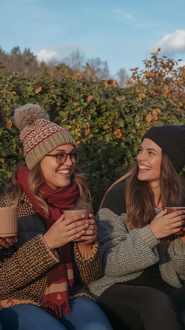 AI Generated Image. Vertical video capturing two women exchanging glances and sharing warm drinks on chilly autumn afternoon. Close-up framing highlighting smiles, hand-held mugs, knit beanies and layered fall outerwear against leafy hedge backdrop. Natural golden light creating warm tones and cozy atmosphere, candid conversational energy. Ideal for social media reels, Instagram Stories, TikTok, and mobile-first video ads promoting coffee, tea, outdoor apparel, friendship campaigns, seasonal promotions. Suggestions for editing: loop-friendly cuts, warm color grade, gentle film grain, soft ambient music, and adding simple text overlays for call-to-action. Licensing ideas: lifestyle blogs, beverage brands, fall travel and hospitality, wellness and mental health messaging focusing on connection and comfort.