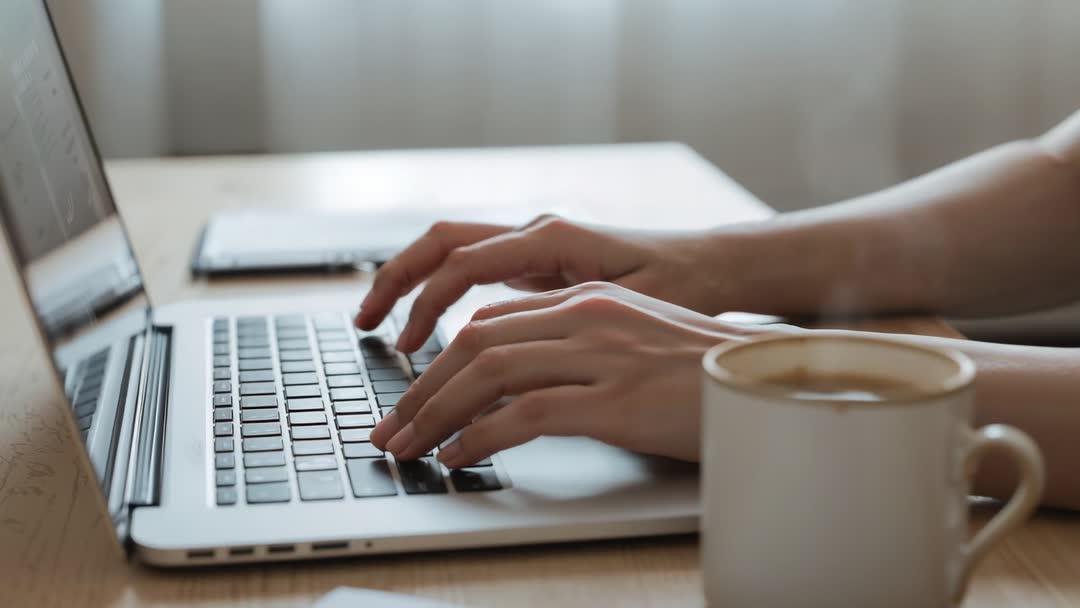 - Typing Hands Working on Laptop with Coffee Mug and Tablet at Minimalist Home Desk
