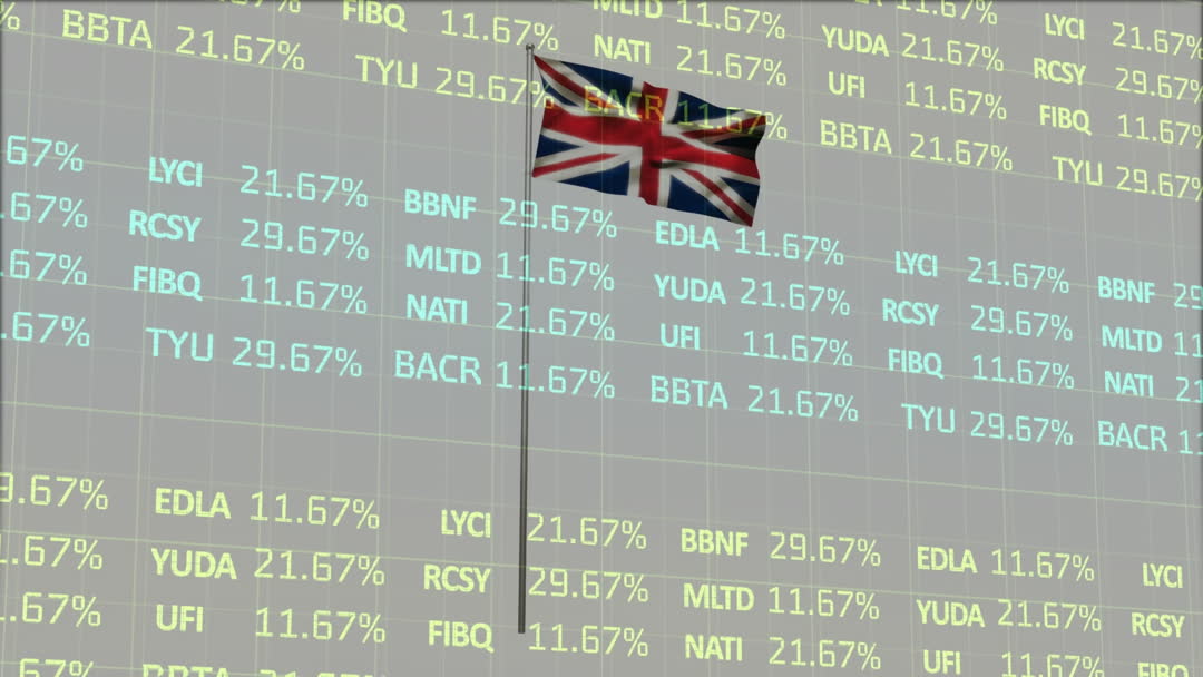 Animation showing stock market data over a waving UK flag, representing national economic and financial trends. Useful for illustrating concepts in British finance, discussing economic changes in the UK, or enhancing digital and multimedia presentations of business technology and investment strategies.