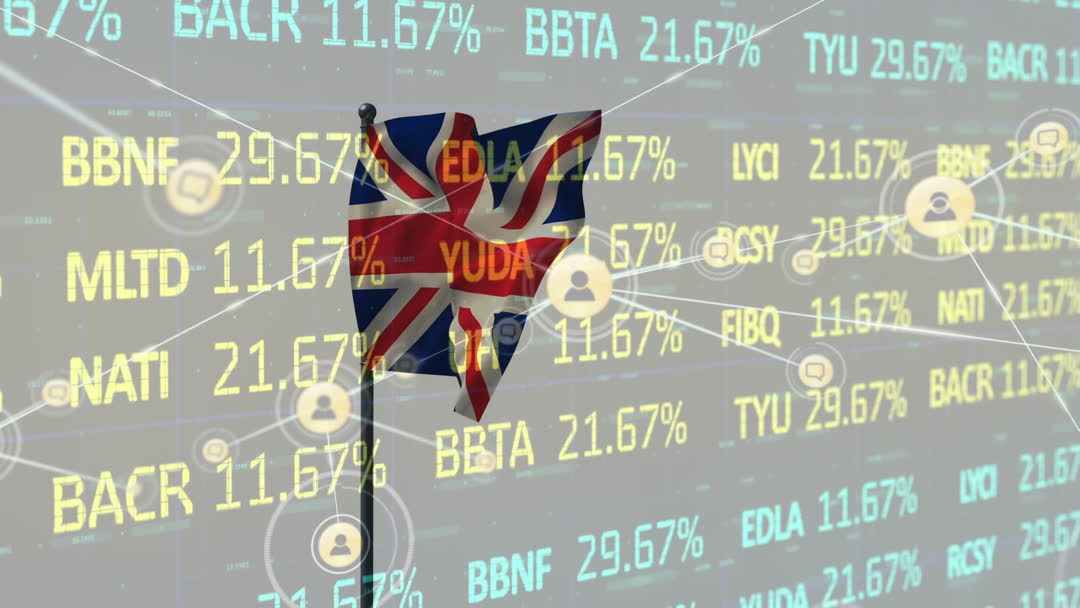 Digital illustration depicting stock market data and networking icons with the UK flag in the foreground. The connection of profile icons suggests themes of national market interactions, online connectivity, and economic technology. Suitable for use in articles about the UK financial market, business technology solutions, or digital economy trends.
