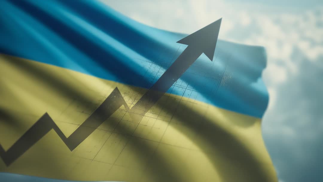 AI Generated Image. Short loopable clip featuring Ukrainian flag waving with rising arrow and grid overlay, conveying economic uptrend and national resilience. Perfect for news segments, financial reports, investor presentations, government briefings, social media posts, website banners, and broadcast openers. Color palette using blue and yellow with soft sky background and dramatic light, creating optimistic and dynamic mood. Overlay arrow animated along grid, representing market recovery, investor confidence, export growth, and economic momentum. Compatible with lower-thirds, headline text, logo animation, and loopable background for slide decks and explainer videos. Ideal duration 6 to 12 seconds for loopable background or hero header, with room for branding and headline captions.