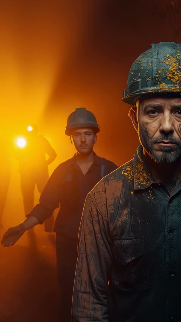 AI Generated Video. Vertical video showing seasoned miner in foreground with dust-smeared face and worn hardhat, younger miners walking behind with headlamps and strong backlight creating silhouettes and warm orange glow. Composition emphasizing close-up portrait on right and deep tunnel perspective on left, leaving vertical copy space for text and graphics. Lighting and color grading offering dramatic cinematic contrast, gritty texture, and high-impact mood for storytelling and editorial use. Ideal for mining industry marketing, safety training modules, documentary sequences, recruitment campaigns, corporate website hero banners, mobile ads, social media stories, and vertical reels. Suggested usage: add bold headline in upper left, apply cinematic LUT and grain, include lower-third for credits, and sync with deep ambient soundtrack for immersive effect. Licensing note: suitable for commercial and editorial use with model releases secured.