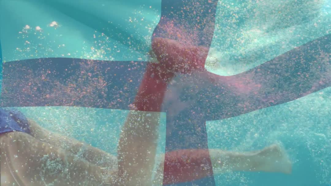 The video shows a swimmer gliding underwater with bubbles and an overlay of the Finnish flag, symbolizing national pride in aquatic sports. This visual is ideal for promotions related to swimming competitions, national teams, semi-transparent flag art, or patriotic sporting events.