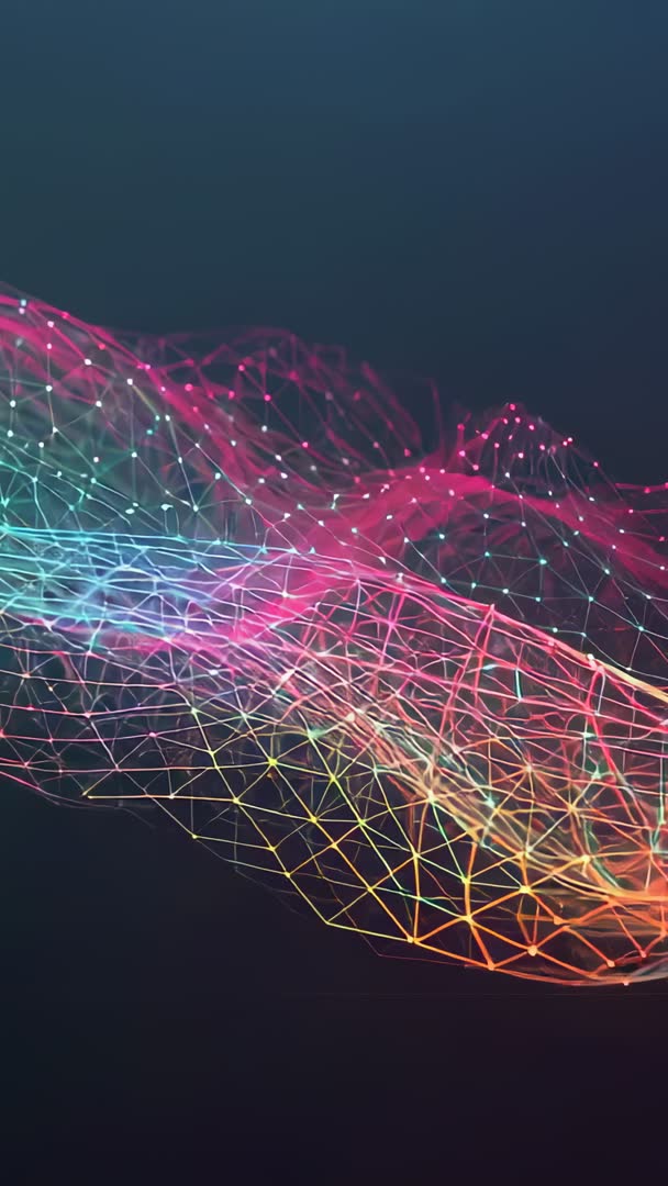 AI Generated Image. Showing sine-driven 3D wireframe mesh undulating across neon gradient with glowing nodes and interconnected lines forming organic waveforms. Featuring vibrant pink, cyan, and amber color palette, subtle depth blur, and smooth motion tailored for vertical video formats. Working as tech intro, data visualization, motion background for presentations, apps, social media reels, product demos. Supporting use cases including AI conference openers, analytics dashboards, music visualizers, futuristic ads, website hero sections, screen displays. Allowing color grading, speed ramping, text overlay, and brand color matching while providing high-contrast area for headlines, logos, and lower-third graphics.