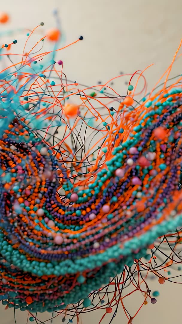 AI Generated Video. Showing undulating wave of tiny multicolor beads threaded on fine filaments, with focus shifting across layered coils and delicate threads springing outward. Offering tight macro texture, vivid color contrast, and rhythmic motion for hypnotic visual interest. Working as loopable vertical background for social media stories, mobile wallpapers, title reveals, or motion graphics. Providing creative asset for product promos, textile and craft advertising, editorial motion pieces, gallery-style motion art, or educational demonstrations of fiber and bead structures.