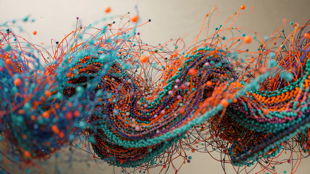 AI Generated Image. Undulating braided mass of tiny beads and wiry filaments flowing through studio space, strands separating and beads drifting in slow motion. Close-up 4K clip capturing rich textures and vibrant color palette of teal, orange, and purple, with shallow depth-of-field and soft studio lighting. Generative 3D animation featuring looping motion, intricate particle paths, and tactile, organic wave shapes conveying energetic and curious mood. Using as loopable background for websites, title sequences, and brand promos. Pairing with ambient soundtrack for gallery installations or event visuals. Applying color palette and bead arrangement as inspiration for textile patterns, packaging, and product surfaces. Editing into short cuts for social media reels and ads or integrating into motion graphics projects and experimental design work.