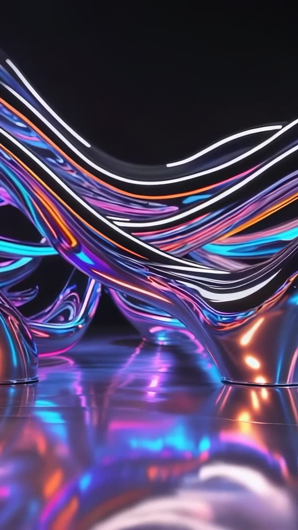 AI Generated Image. Vertical looping footage showing undulating chrome sculpture glowing with neon stripes and reflecting on glossy floor inside dark void. High-contrast color palette of cyan, magenta, orange creating dynamic abstract motion and mirrored highlights. Footage suiting futuristic tech promos, electronic music visualizers, event openers, smartphone wallpapers, UI backgrounds, social media reels. Clip offering loopable seamless motion and ample negative space in upper area for title or logo placement. Editing suggestions: apply slow-motion crop, adjust color grade, add particle or lens flare overlays, insert subtle camera shake for cinematic feel. Clip ready for vertical screens and 4K workflows, ideal for motion graphics projects, commercial licensing, immersive installations.