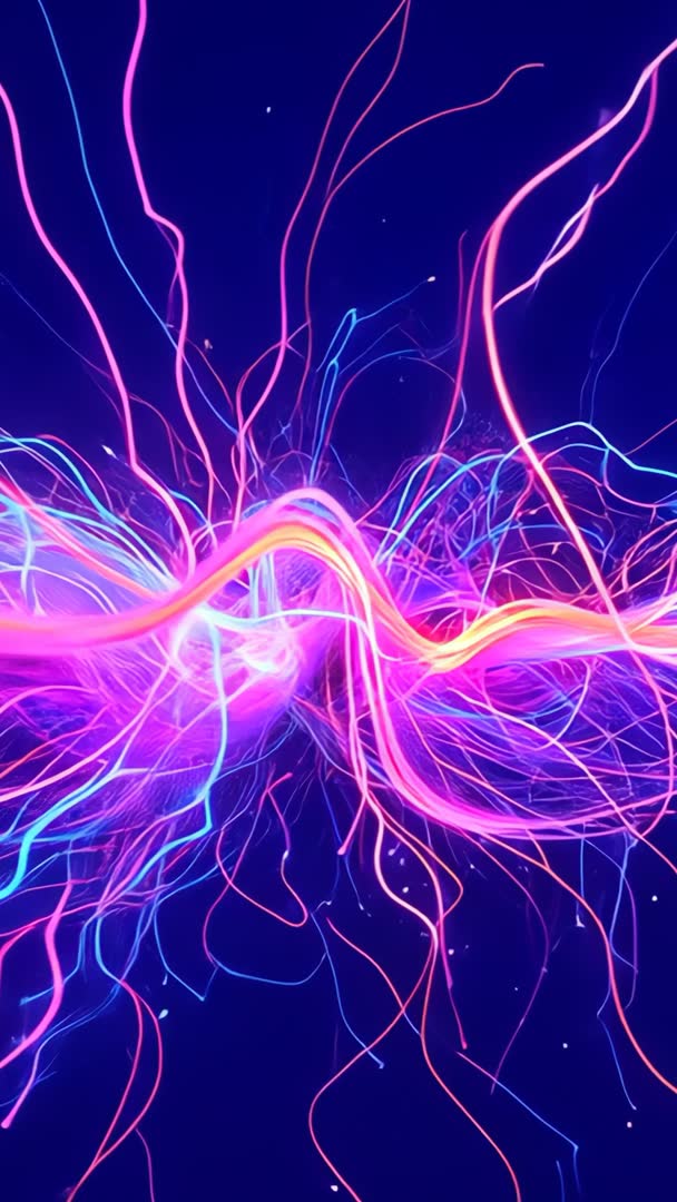 AI Generated Image. Showing undulating neon ribbon emerging from deep digital void, radiating dozens of slender light strands and pulsing with electric magenta, cyan, violet. Offering seamless vertical loop composition optimized for mobile-first projects and social platforms. Delivering high-energy abstract motion perfect for music video backgrounds, VJ performances, title intros, app splash screens, tech product launches, advertising stories. Featuring vivid neon palette, high contrast, smooth motion paths ideal for color grading, blend modes, speed ramping, and overlay effects. Suggesting use as dynamic backdrop for presentations, UI animations, live visuals, or brand campaigns seeking futuristic, energetic mood. Providing vertical 9:16 aspect ratio, loop-friendly center composition, and versatile color channels for quick customization.