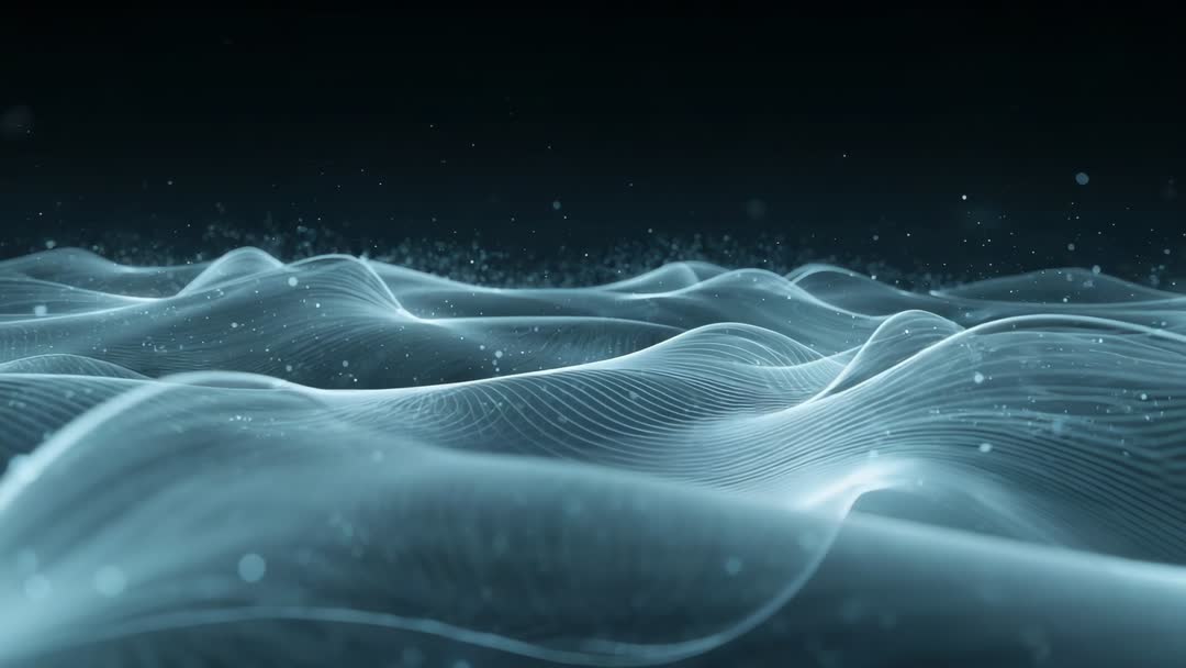 AI Generated Video. Depicting glowing undulating wireframe waves moving across dark void with drifting particles, rim lighting, and subtle volumetric glow to create cinematic depth. Composing wide aspect ratio loop suitable for seamless playback in motion projects and background visuals. Serving as technology intro, sci-fi trailer backdrop, music visualizer layer, website hero loop, broadcast lower-third background, VJ set element, product launch animation, or corporate presentation opener. Allowing color grading, speed ramping, masking, and overlaying text or logos without visual clutter. Providing moody neon tones that pair well with minimal typography, modern UI elements, and data-driven graphics.