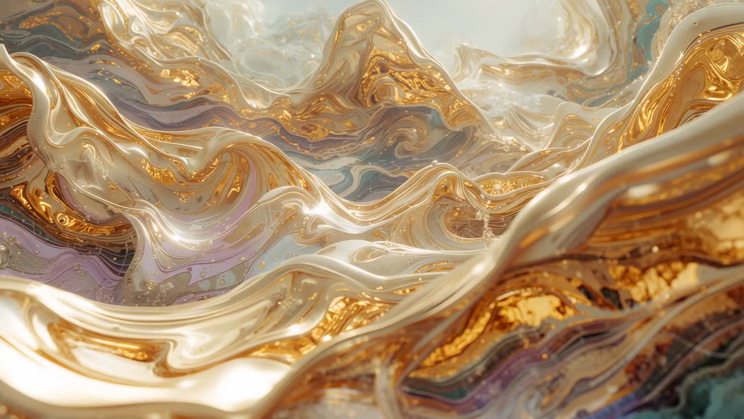 AI Generated Image. Clip showing pearlescent ribbons flowing across molten gold veins, creating undulating abstract landscape. Smooth translucent layers blending with metallic highlights, producing warm amber and pastel tones while fine particles drift through scene, adding depth and cinematic motion. High-resolution 3D render generated using AI-assisted tools, offering seamless loop potential and strong visual impact for luxury projects. Serving as luxury brand opener, product showcase background, motion graphics accent, or decorative loop for hospitality and fashion projects. Working well for website hero banners, video intros, social media ads, presentation backdrops, or editorial stills. Providing color grading flexibility for adaptation to warm or cool palettes. Delivery suggestions: export loopable MP4 or MOV, include alpha channel when separation required, supply 4K and HD masters. Licensing note: verify AI-origin content policy with distribution platform before commercial use.