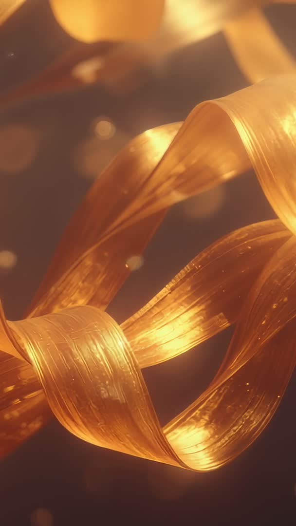 AI Generated Image. Showing unfurling golden ribbons twisting into knot, glowing with warm bokeh highlights and drifting particle sparks. Featuring translucent metallic texture, soft depth-of-field, and slow cinematic motion ideal for vertical screens. Suiting luxury brand intros, mobile ad backgrounds, social media story content, title sequences, product reveal animations, and wallpaper loops. Providing seamless loop potential and easy color grading for brand tones. Recommending use in reels, vertical billboards, app splash screens, and motion design projects needing elegant warm abstract backdrop.