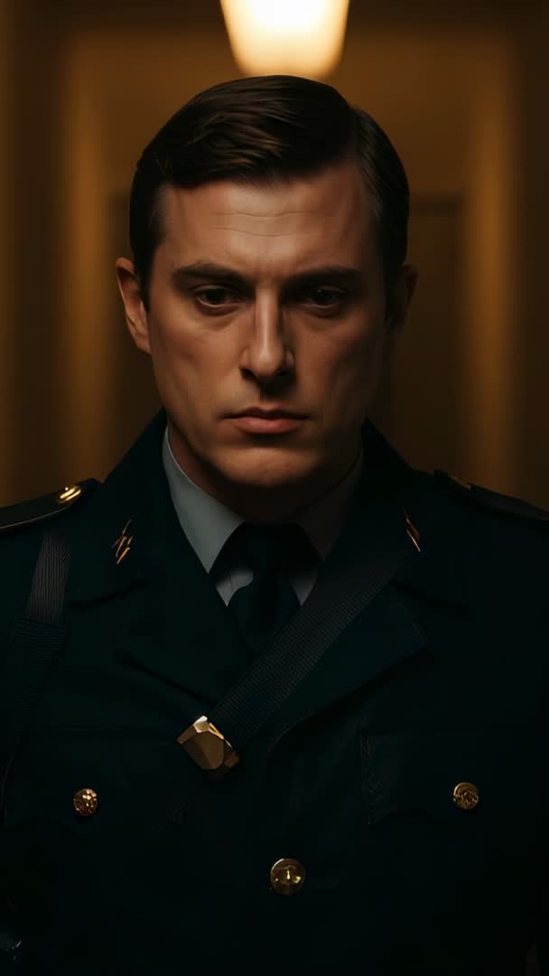 AI Generated Image. Showing uniformed officer pausing and turning toward door in dim corridor with badge and shoulder strap clearly visible. Featuring tight vertical framing optimized for mobile screens and social media platforms. Capturing stern facial expression and disciplined posture conveying duty, authority, tension and internal conflict. Offering cinematic low-key lighting, shallow depth of field and warm color grading for moody dramatic tone. Serving as B-roll for security training, law enforcement recruitment, editorial pieces on policing, documentary sequences or promotional trailer for crime drama. Providing clean space for overlay text and titles above head or along lower third for headlines or call-to-action. Delivering vertical orientation ready for Instagram Reels, TikTok, Snapchat, mobile ads and stories. Adding subtle ambient sound, slow push-in or reveal cut for enhanced cinematic tension. Suggested export settings: 9:16 aspect ratio, 4K or 1080p, 24fps for filmic look.