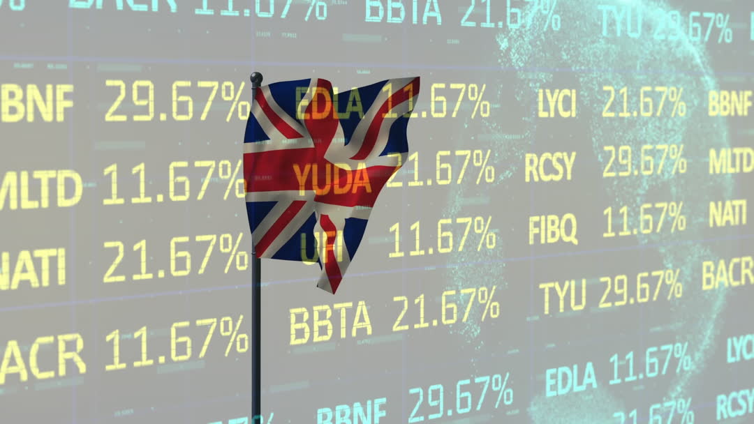 Union Jack Overlapping Global Stock Market Data and Rotating Globe Video