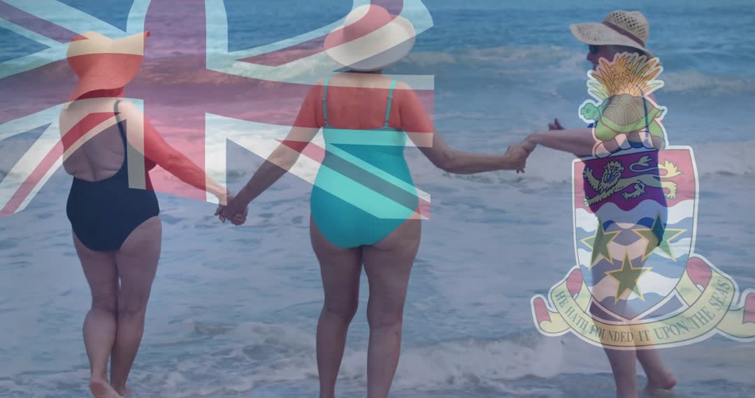 Women holding hands on beach represent unity and diversity. Union Jack flag and coat of arms add celebration. Useful for promoting themes of unity, cultural diversity, and joyful travel experiences.