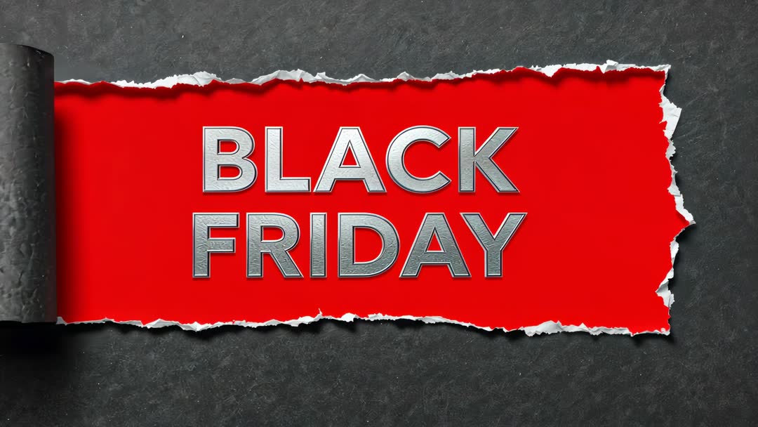 AI Generated Image. Video showing unrolling black paper layer revealing bright red torn strip with metallic silver BLACK FRIDAY lettering. Composition featuring high contrast between dark textured backdrop and vivid red reveal, creating dramatic promotional moment. Motion focusing on peeling edge and rolled paper curl, adding tactile feel and depth. Typography presenting bold metallic letters with embossed texture and subtle drop shadow for premium look. Color palette using deep black, vibrant red, and silver for strong visual impact and clear sale messaging. Perfect for Black Friday campaign videos, retail advertising clips, email header animations, website hero banners, social media countdowns, TV commercial openers, in-store digital signage. Customization options including replacing lettering, adjusting color scheme, inserting discount tags, animating peel timing, adding sound effects, integrating brand logo. Usage ideas: creating urgent sale promos, highlighting limited-time offers, launching product drop videos, producing storefront displays, boosting click-through rates on landing pages. High-resolution frame suitable for editing, compositing, and motion graphics projects.