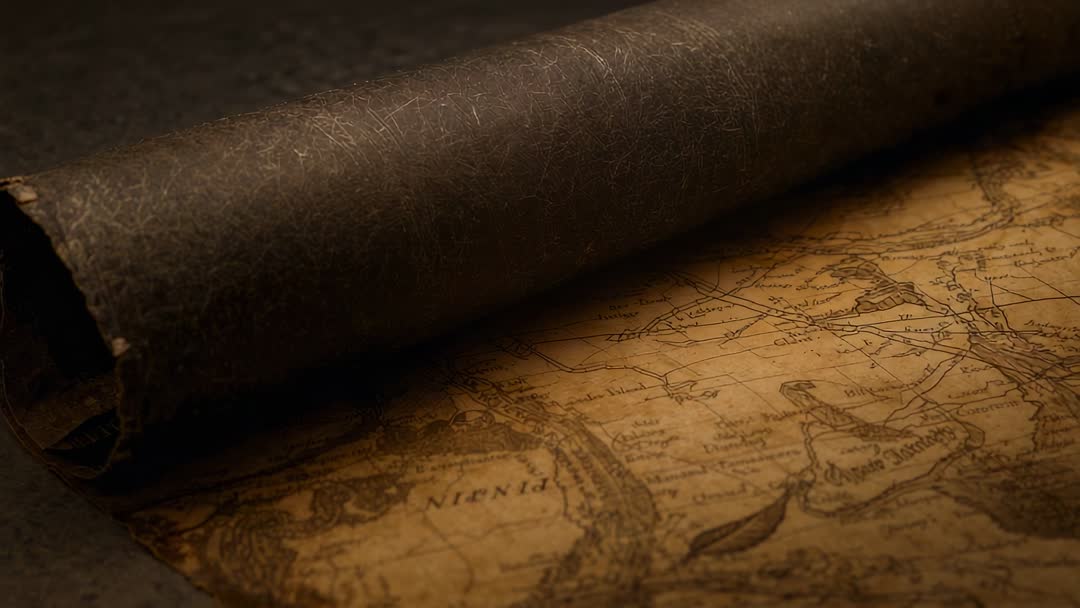 AI Generated Image. Short cinematic clip showing unrolling aged parchment over antique map, revealing detailed coastal cartography under warm warm light. Closeup framing highlighting vellum grain, rolled edge, inked coastline, faded place names. Featuring warm sepia tones, soft directional lighting, shallow depth of field, cinematic 16:9 composition. Use for historical documentary openers, period drama title sequences, museum exhibit promos, book trailers, travel storytelling, website headers, background for editorial layouts. Works well as hero background, lower-third overlay, printed poster, social media clip, educational explainer asset. Editing suggestions: slow pan or gentle zoom for dramatic reveal, overlay subtle film grain and typographic titles for vintage feel.
