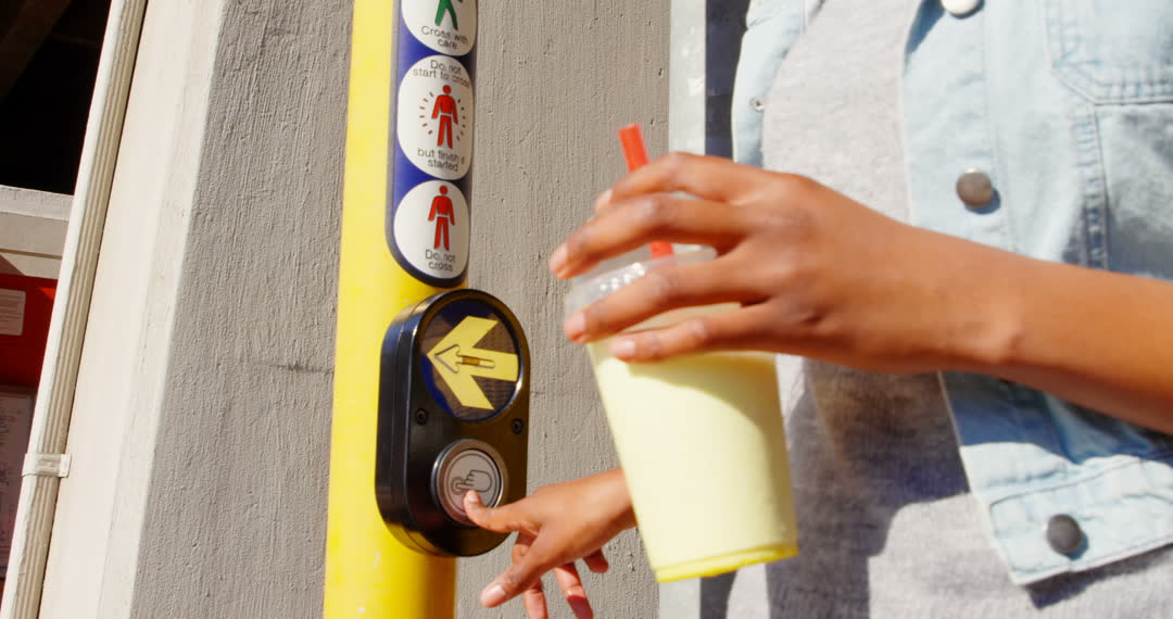Image capturing a woman holding a milkshake while pressing a button at a pedestrian crossing provides a relatable scene of urban life. Useful for projects focusing on everyday city activities, traffic safety campaigns, or editorial content about urban lifestyles and diverse city environments.