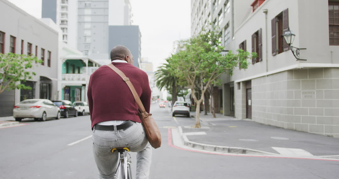 Man riding bicycle in urban setting, reflecting eco-friendly transportation choices. Suitable for illustrating sustainable transport, travel escapades, urban exploration, or lifestyle blogs focusing on eco-conscious living in the city landscape.