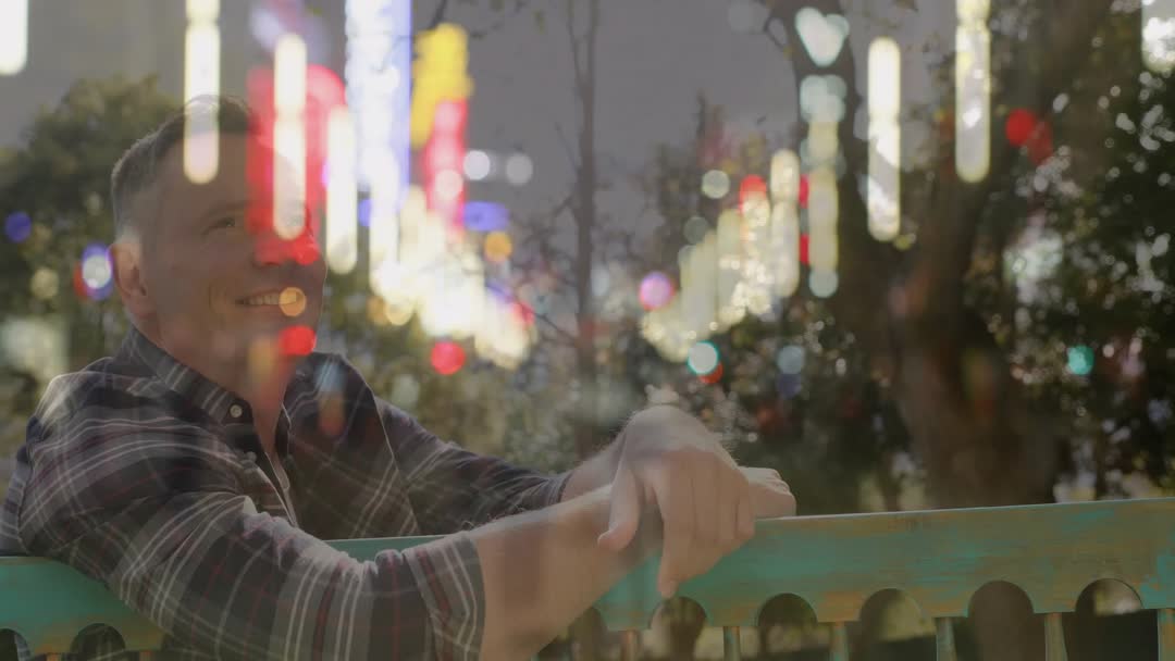 Capture of a man taking a relaxed moment in an urban setting, bathed in soft neon reflections. Gives idea of tranquility and modern life. Perfect for concepts centered on relaxation in bustling city life, modern lifestyle blogs, or advertising products tied to comfort and leisure amidst urban spaces.