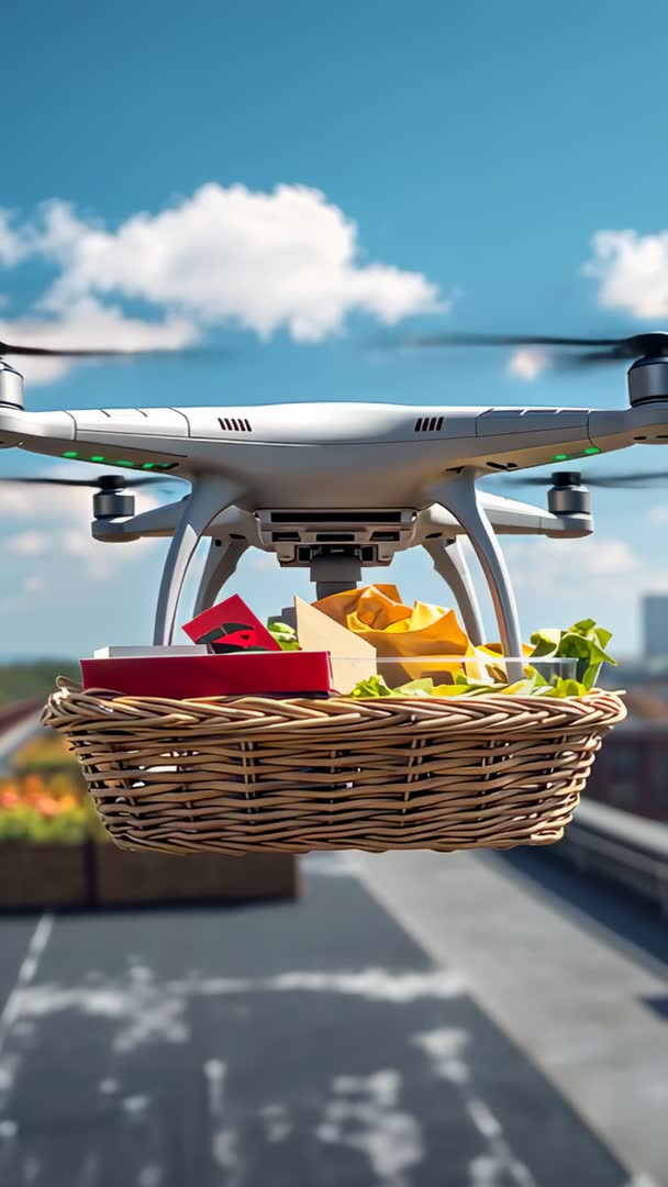 AI Generated Video. Video showing consumer quadcopter carrying wicker basket filled with parcels, takeout containers, and gift boxes while flying low over rooftop against blue sky and distant urban skyline. Footage conveying contactless delivery, last-mile logistics, modern e-commerce, and innovative courier technology. Working well for website hero headers, app demo reels, crowdfunding pitches, logistics presentations, marketing for delivery startups, urban planning reports, social media vertical ads, and tech news segments. Suggesting editing ideas: cropping for close-up on basket and parcel branding, adding overlay text and motion graphics for pricing or call-to-action, using slow motion reveal to emphasize rotor motion, matching cut to ground-level delivery for narrative continuity. Stock friendly attributes: bright daytime lighting, clear sky, dynamic movement, clean consumer drone framing. Licensing options permitting commercial advertising, editorial technology coverage, startup branding.