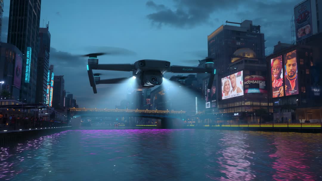 - Urban drone hovering over neon-lit river at dusk, cinematic night patrol with spotlights