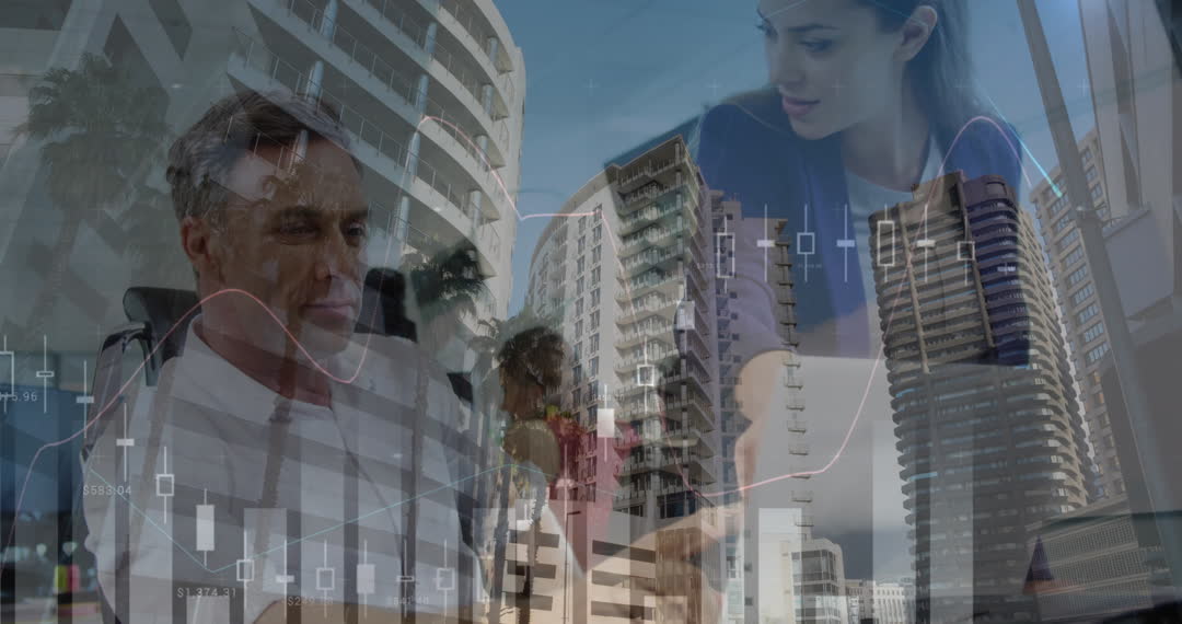 Visual combines financial graphs and modern architecture, symbolizing integration of business strategies and the urban environment. Suitable for content on global financial markets, business solutions, and collaborative discussions in corporate settings. Perfect for illustrating concepts around technology-enhanced business decision-making and urban economic development.