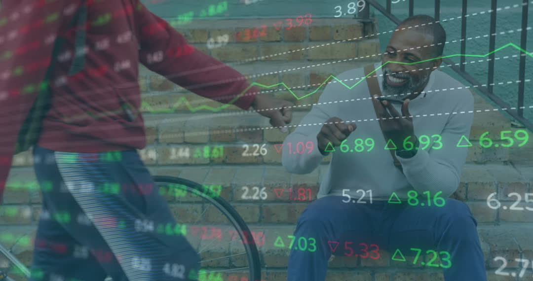 This scene captures an expressive moment of friendship with men fist bumping outdoors, layered creatively with stock market data. It showcases the blend of everyday life with the influence of global business trends. The dynamic data overlay provides an engaging visualization for themes of urban living and technological integration. Ideal for use in articles about modern economics, financial markets influence on day-to-day activities, or in campaigns highlighting connectivity through data.