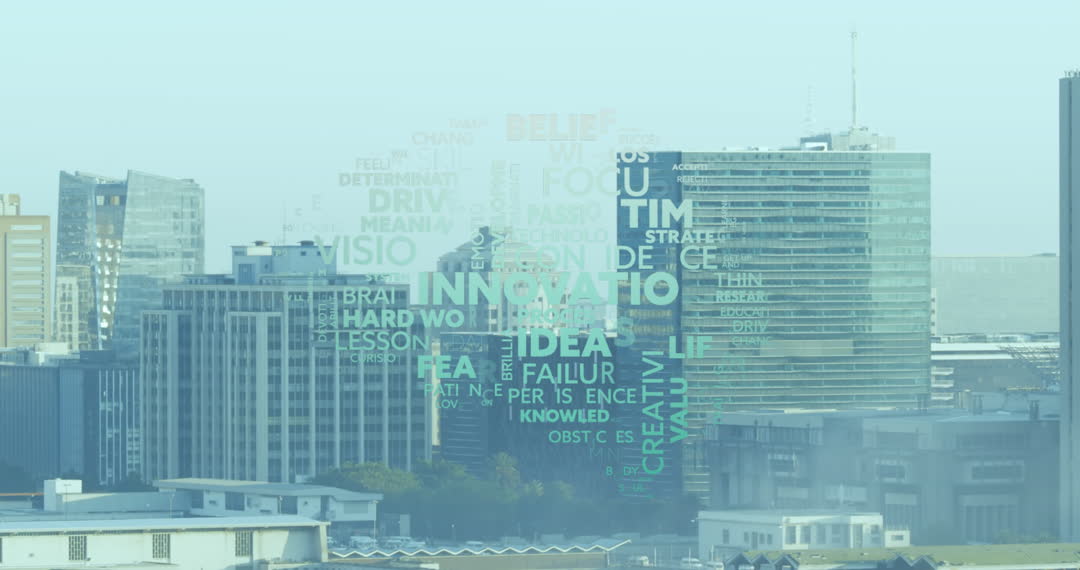 Dynamic display combining business-themed text with a city skyline, projecting concepts like innovation and creativity. Subtle, engaging backdrop for presentations about urban development, business strategies, or technological advancements requiring a modern, forward-thinking visual context.