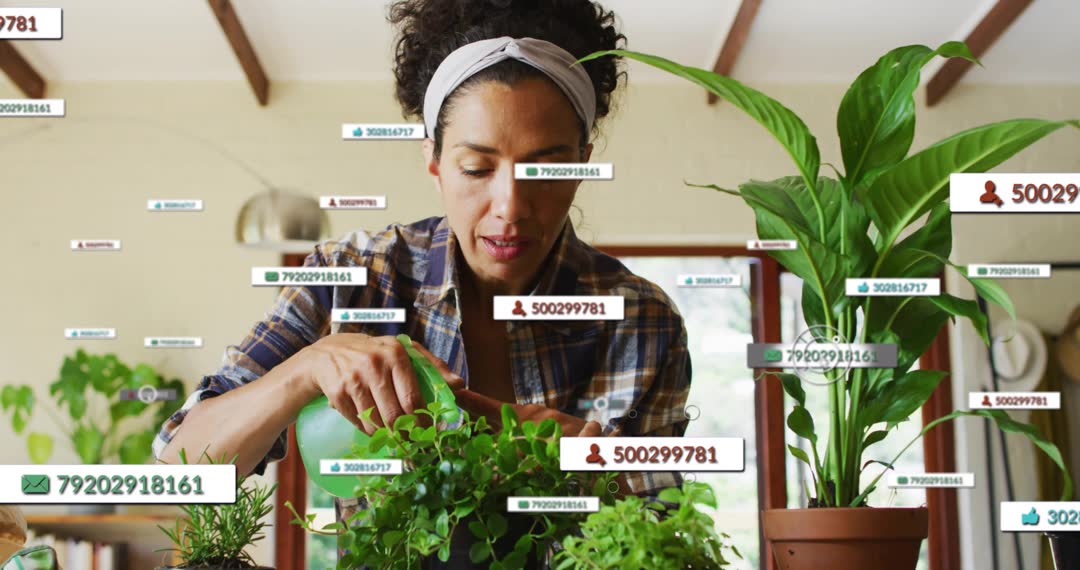 - Urban gardener live streaming indoor plant care tutorial with viewer count and social overlays