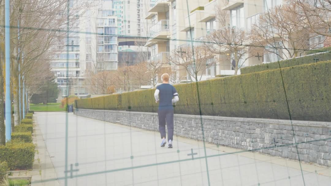 Video showing male jogger jogging away from camera along wide paved walkway bordered by trimmed hedges and modern apartment buildings. Faint grid overlay in foreground creating abstract layered look and adding depth. Overcast light with bare winter trees and muted color palette conveying cool-season atmosphere. Casual athletic clothing and sneakers suggesting everyday training and steady pacing. Use for fitness promotions, urban lifestyle content, real estate marketing, wellness campaigns, corporate wellness pieces, social media banners, website hero loops, broadcast backgrounds, or editorial cutaways. Left empty space offering room for headline, logo, lower-third captions, or call-to-action overlays. Recommending subtle color grading and speed ramping to emphasize motion. Clip working well as seamless background loop or supportive B-roll in video edits and ad campaigns.