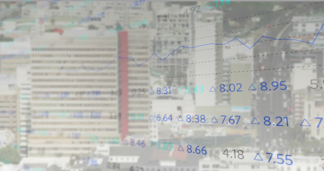 This depicts an urban environment with data analytics visually overlaid on top, showcasing a tech-oriented experience blending real estate with digital information. The line graphs and numerical data suggest themes of market trends, financial analysis, or comprehensive urban metrics often associated with smart city technologies. Ideal for use in business presentations, technological articles, or platforms discussing modern city developments or financial market strategies.