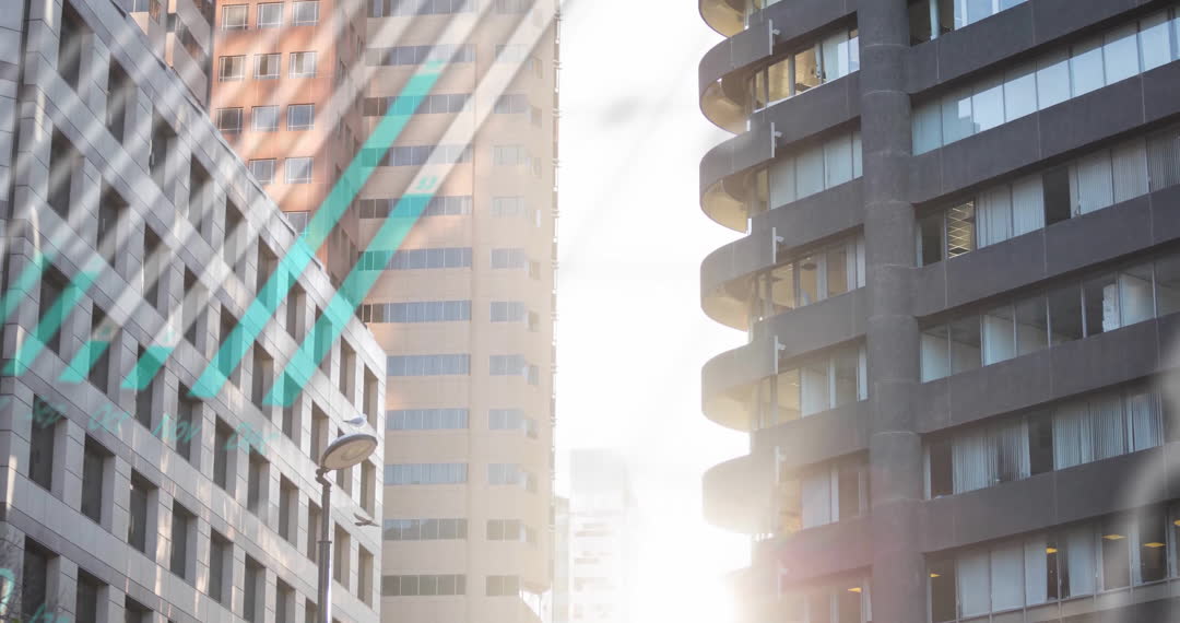 Tall modern buildings in an urban environment with digital financial data graphics like charts and lines overlaying the scene. Ideal for topics related to global finance, technology in the business community, modern architecture and city living, discussions on innovative economic practices, and advertisements for financial services or tech companies focusing on future foresight.
