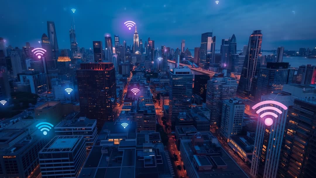 AI Generated Image. Image showcases city skyline at dusk dotted with floating Wi-Fi icons, symbolizing connectivity. The vibrant, digital concept art highlights technological advancements. Perfect for illustrating smart city tech innovations, digital network articles, or urban development presentations.