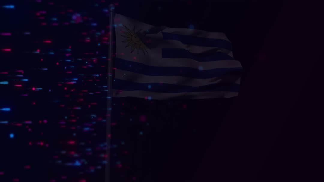 - Uruguay Flag Flapping Gently Against Night Sky and Digital Streams