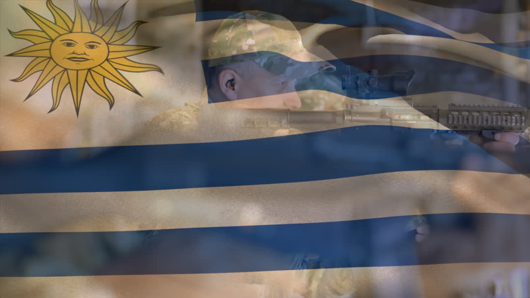 The video combines the Uruguayan flag with a soldier aiming a rifle, evoking themes of patriotism and national defense. This compelling visual can be used for articles on military forces, national celebrations, or discussions of security and defense strategies.