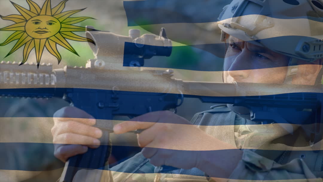 Image depicts a male soldier equipped with a weapon, overlayed with the flag of Uruguay. It symbolizes military pride and national defense. Could be used to illustrate articles on Uruguayan military history, defense strategies, or international peacekeeping roles involving Uruguay.