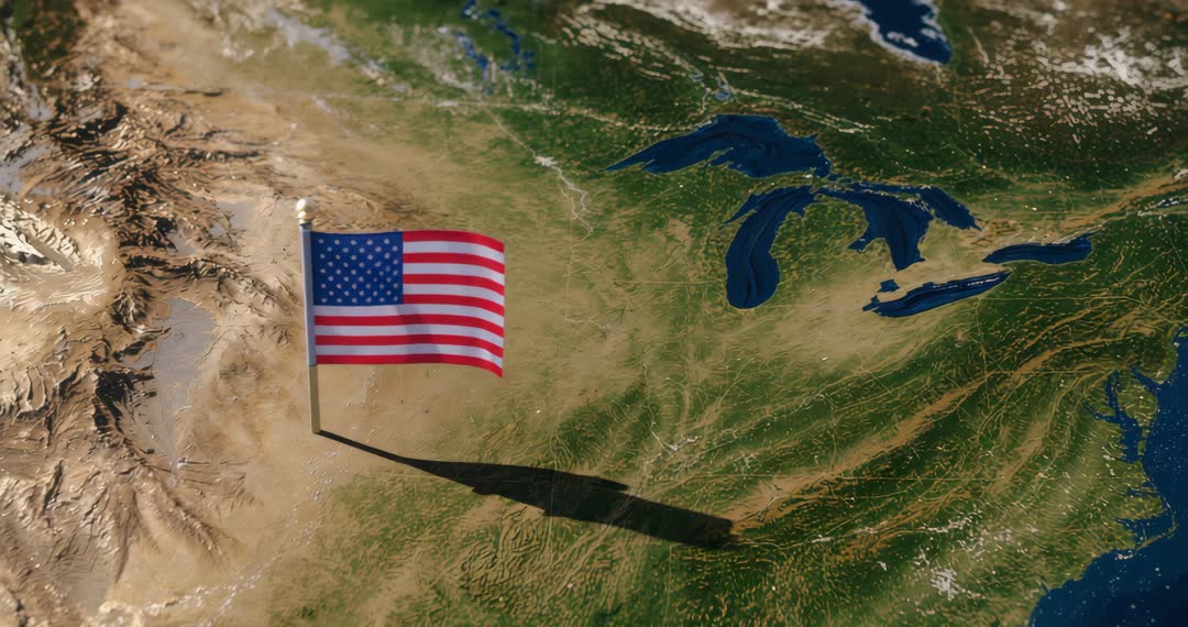 AI Generated Video. Video offers striking aerial perspective of United States geography with focus on large flagpole flying American flag over a vast landscape featuring the mountains and plains. Casting its shadow on terrain, scene emphasizes notions of national pride and natural beauty. Suitable for themes of American culture, geography education, or patriotic occasions, as well as environmental or map-based projects.