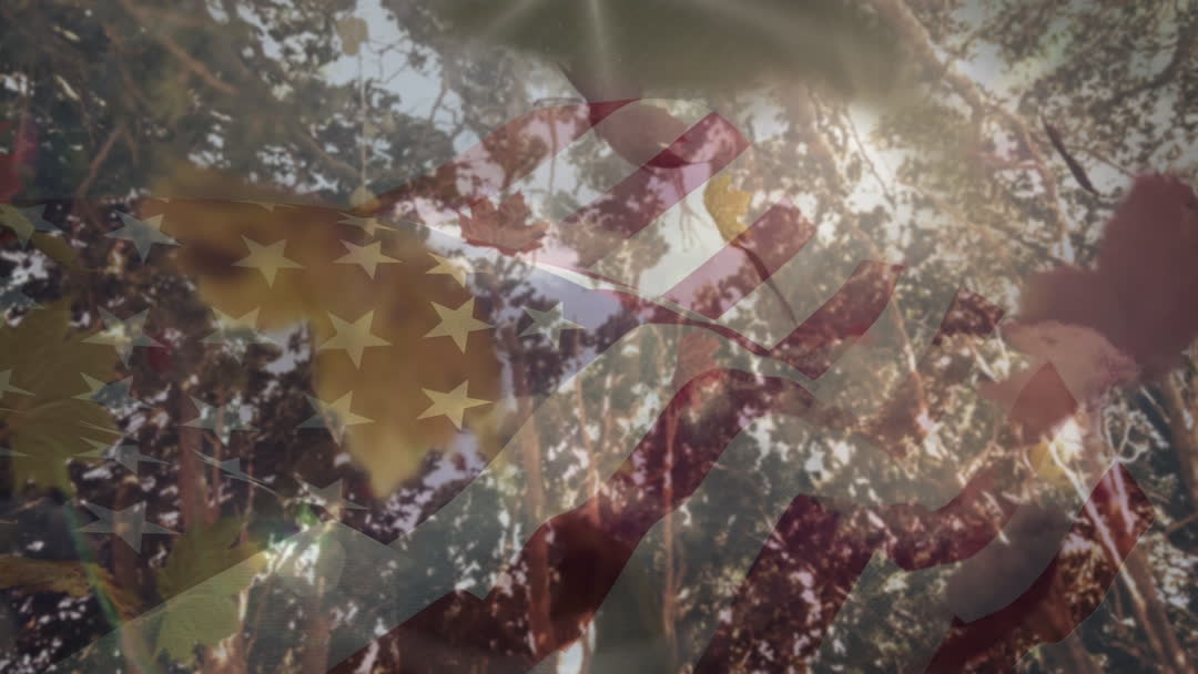 Scene blends elements of nature, specifically trees and autumn leaves, with videory of USA flag. Creating a patriotic feel. Suitable for illustrating concepts of American patriotism, environmental awareness, seasons change. Ideal for blogs, social media, festive headers.